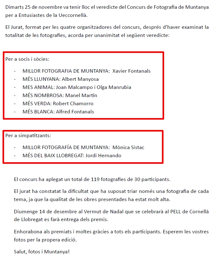 3ª OBRES: Cada participant podrà presentar un màxim de cinc obres, han de ser fotografies originals que no hagin estat premiades amb anterioritat per la UECCornellà.