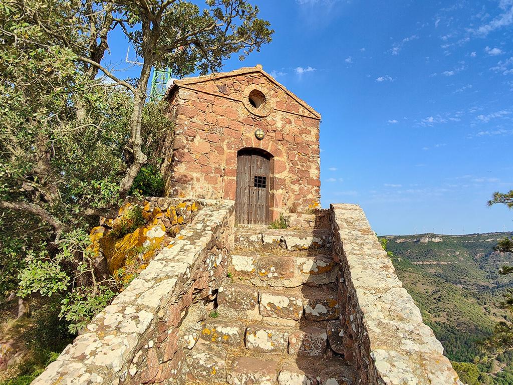 Una agulla de gres vermell, sobre el Castell d’Escornalbou i dominant tot l’entorn, s’alça l’ermita de Santa Bàrbara, observant majestuosament la contrada.